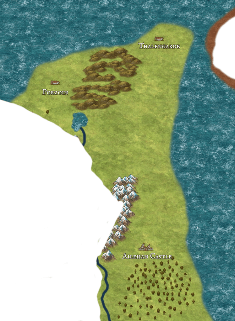 The grasslands went on and on to the south as far as Traudl could see. Just south west of Porzoin the grasslands began to stretch west again until they sank into a black swamp, and then beyond that was the sea she spotted earlier. To the east, the mountain range curved into a crescent shape, and had a large cave at its center. South of that, the mountains receded to grasslands, indicating there might be a passage straight east to Ailehan. Finally, over the horizon, a tower and a town appeared, beyond that was a mountain range that stretched from the sea to the west, all the way across the river towards Ailehan.